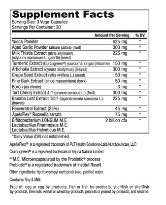 , Artichoke Extract powder, Grape Seed Extract 95% OPC, Pine Bark Extract 95% OPC, Yucca, Aged Garlic, Milk Thistle Extract, Boron Citrate, GutBuddies™ Probiotic, Tart Cherry Extract, Resveratrol Extract, Banaba Leaf Extract, and AprésFlex® Boswellia Extract, we comprehensively address nearly every aspect of the immune system. This is achieved safely and naturally, without the burden of undesirable side effects commonly associated with modern medicine choices.